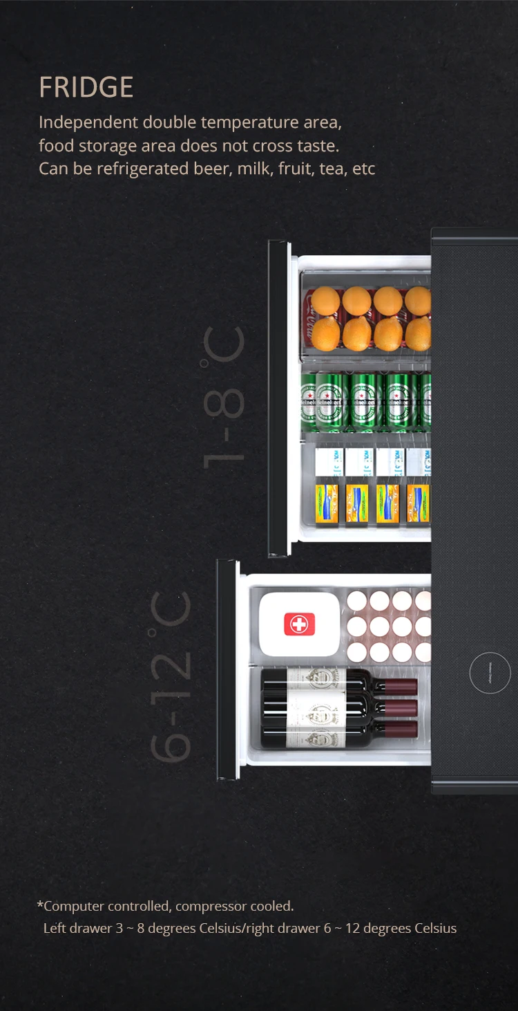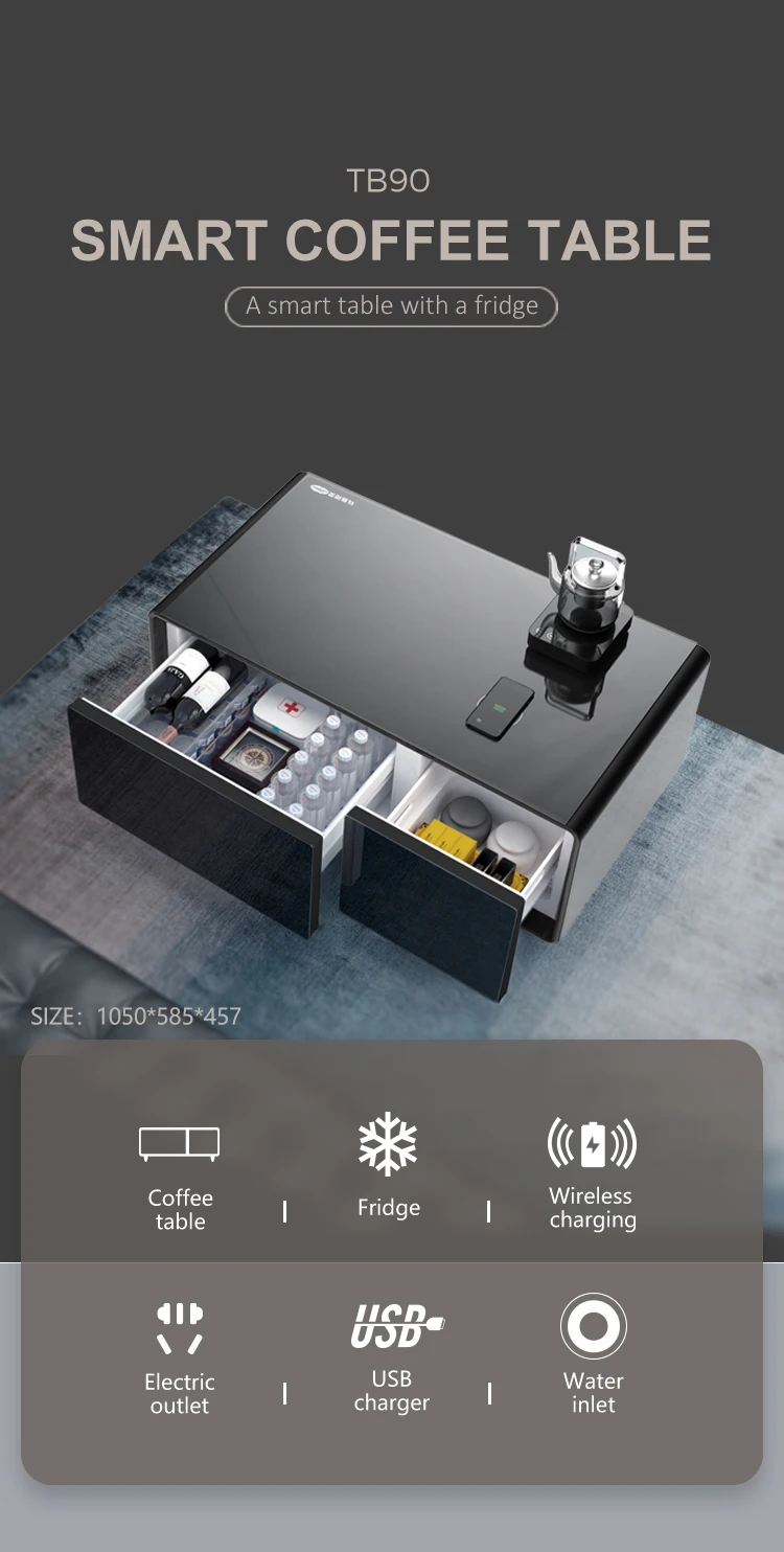 Smart coffee table with wireless charging refrigerator.